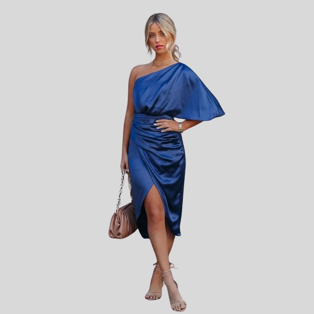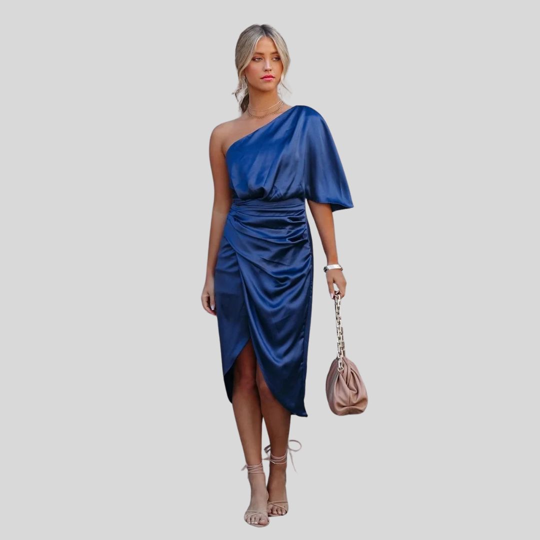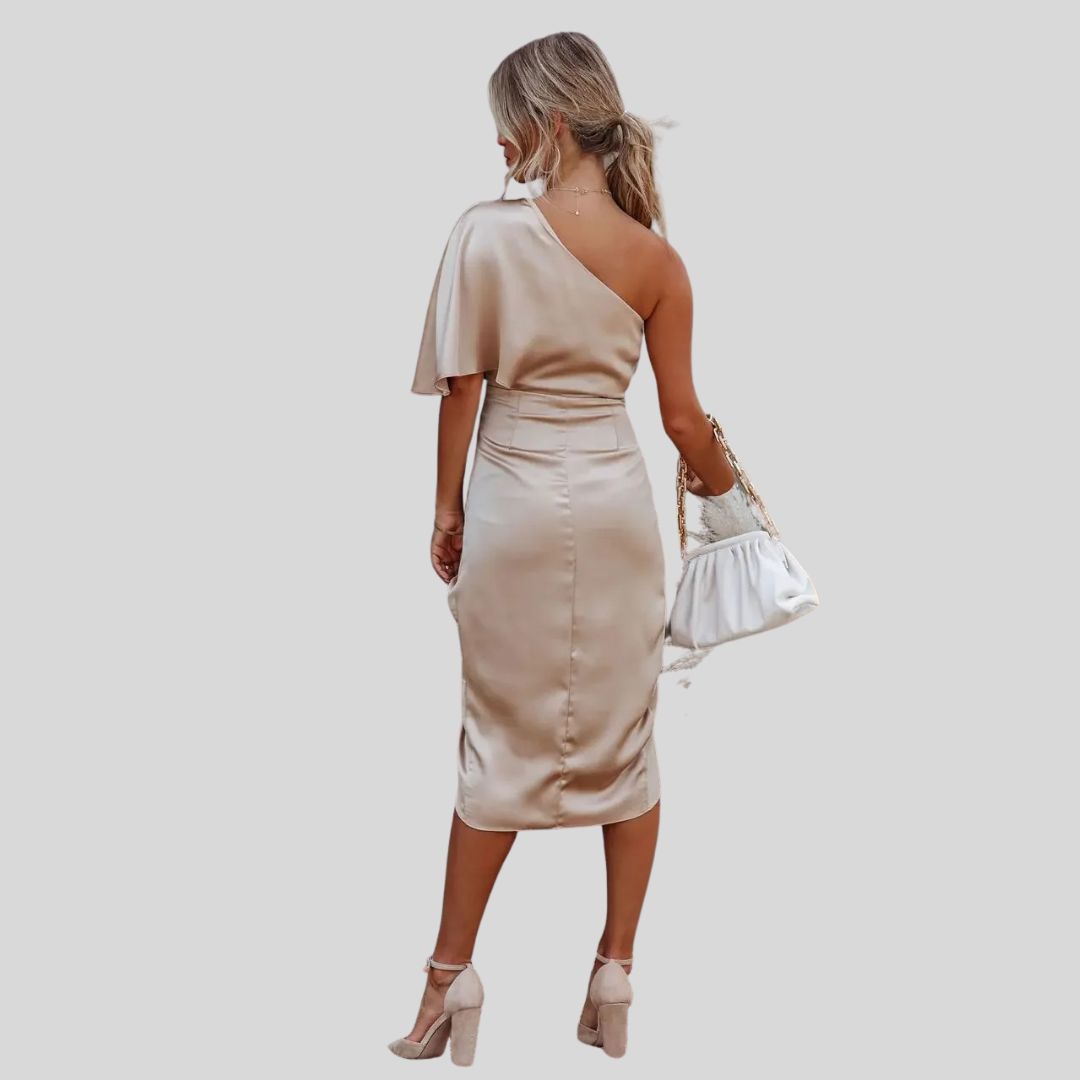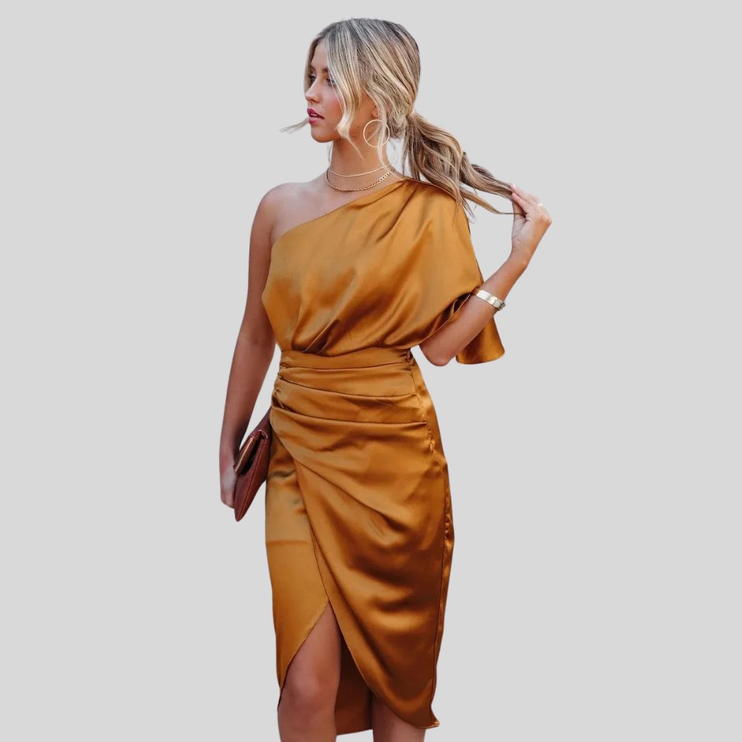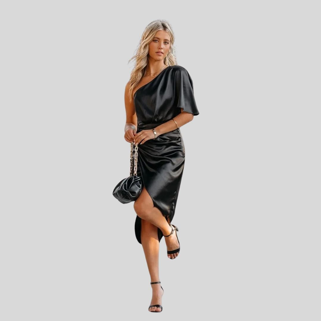 Eleganz auf einen Blick – Satiniertes Kleid mit einem Schulterband