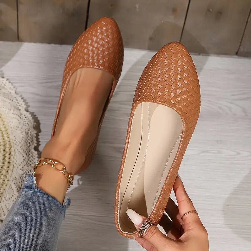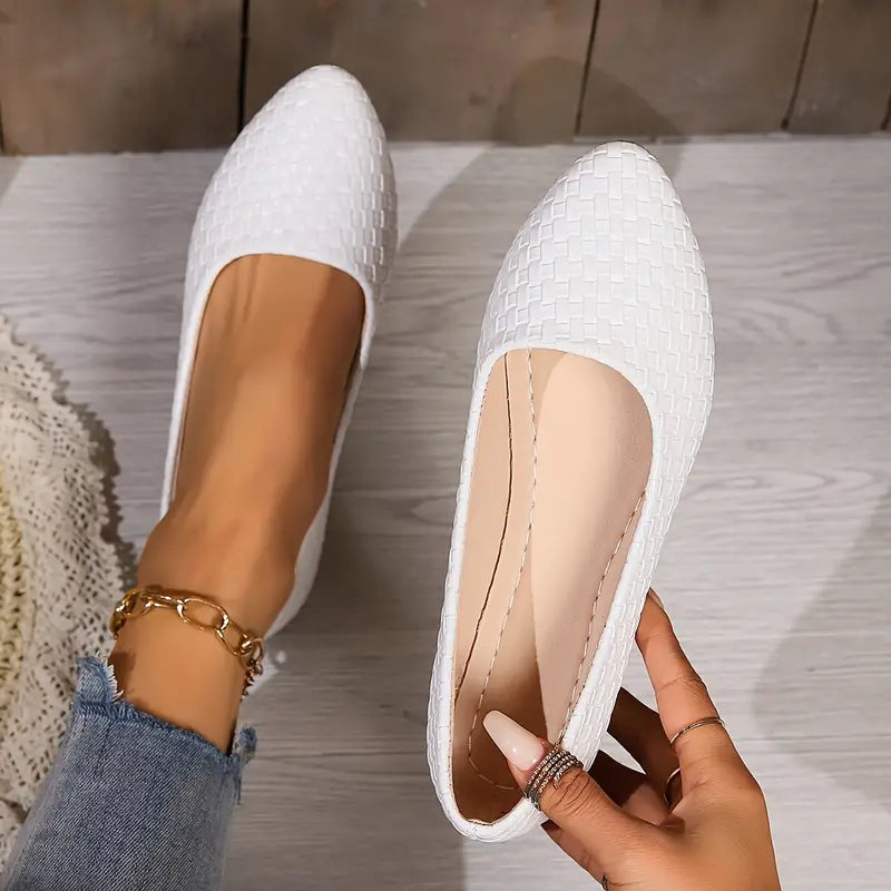 Intro Description: Erleben Sie die perfekte Mischung aus schlichter Eleganz und modernem Design mit den Oriana flachen Schuhen. Diese Schuhe mit spitzer Zehe und geflochtenen Details sind die ideale Wahl für stilbewusste Frauen, die Wert auf Raffinesse und Komfort legen. Perfekt für das Büro, besondere Anlässe oder den Alltag – diese Flats sind ein echter Hingucker.